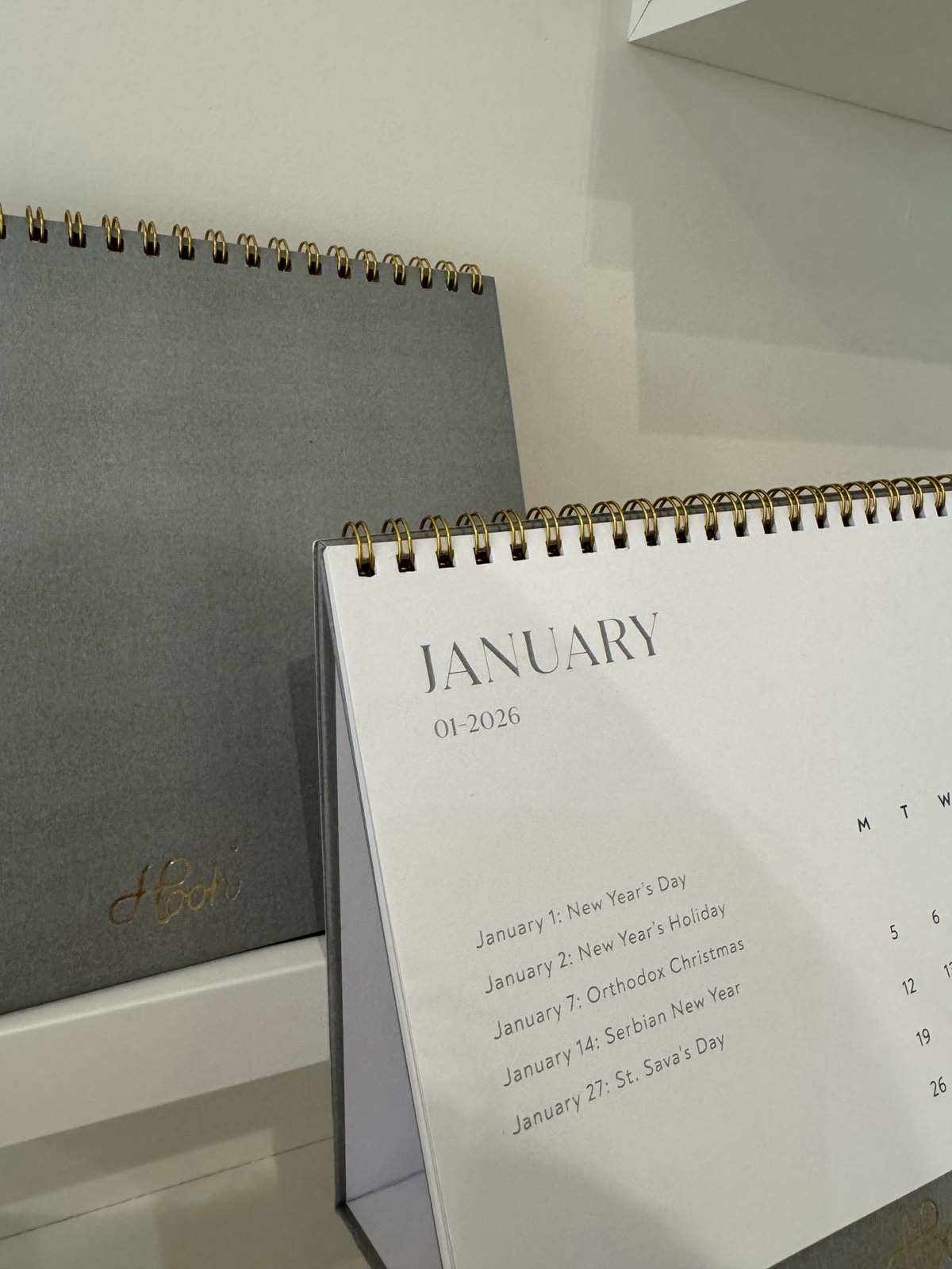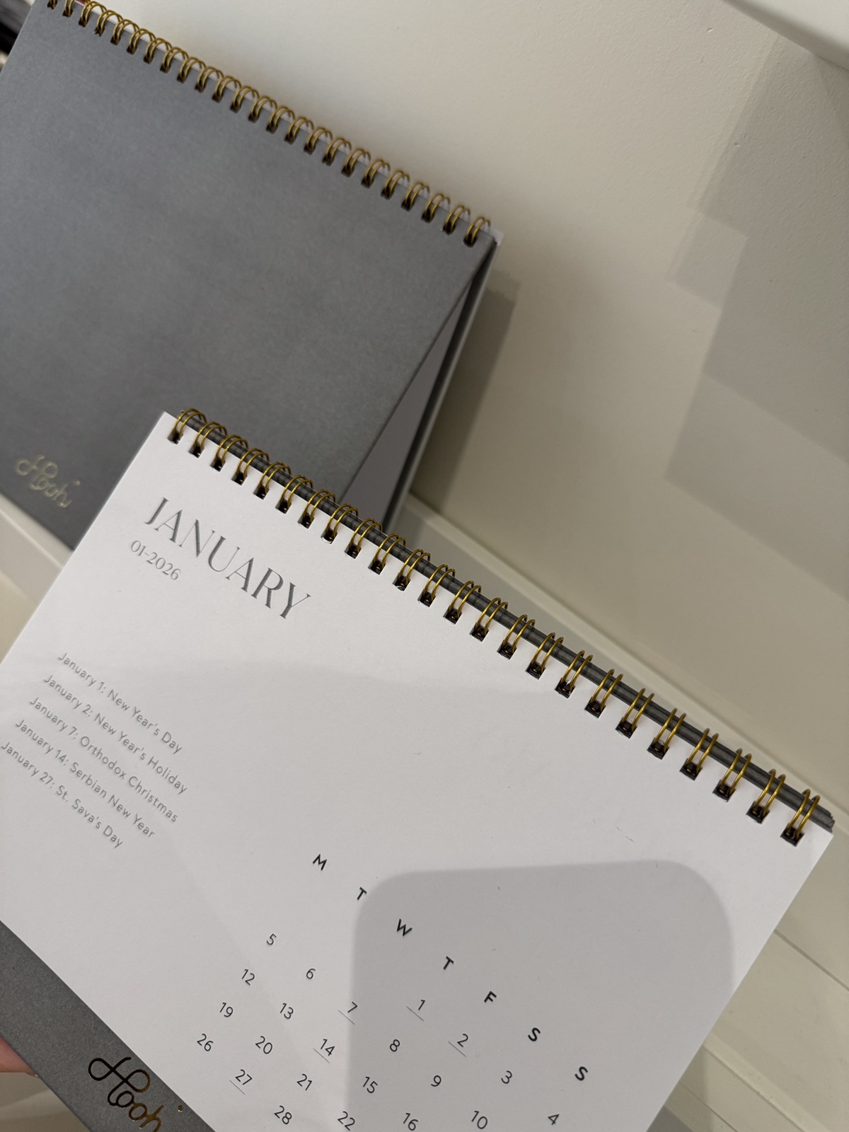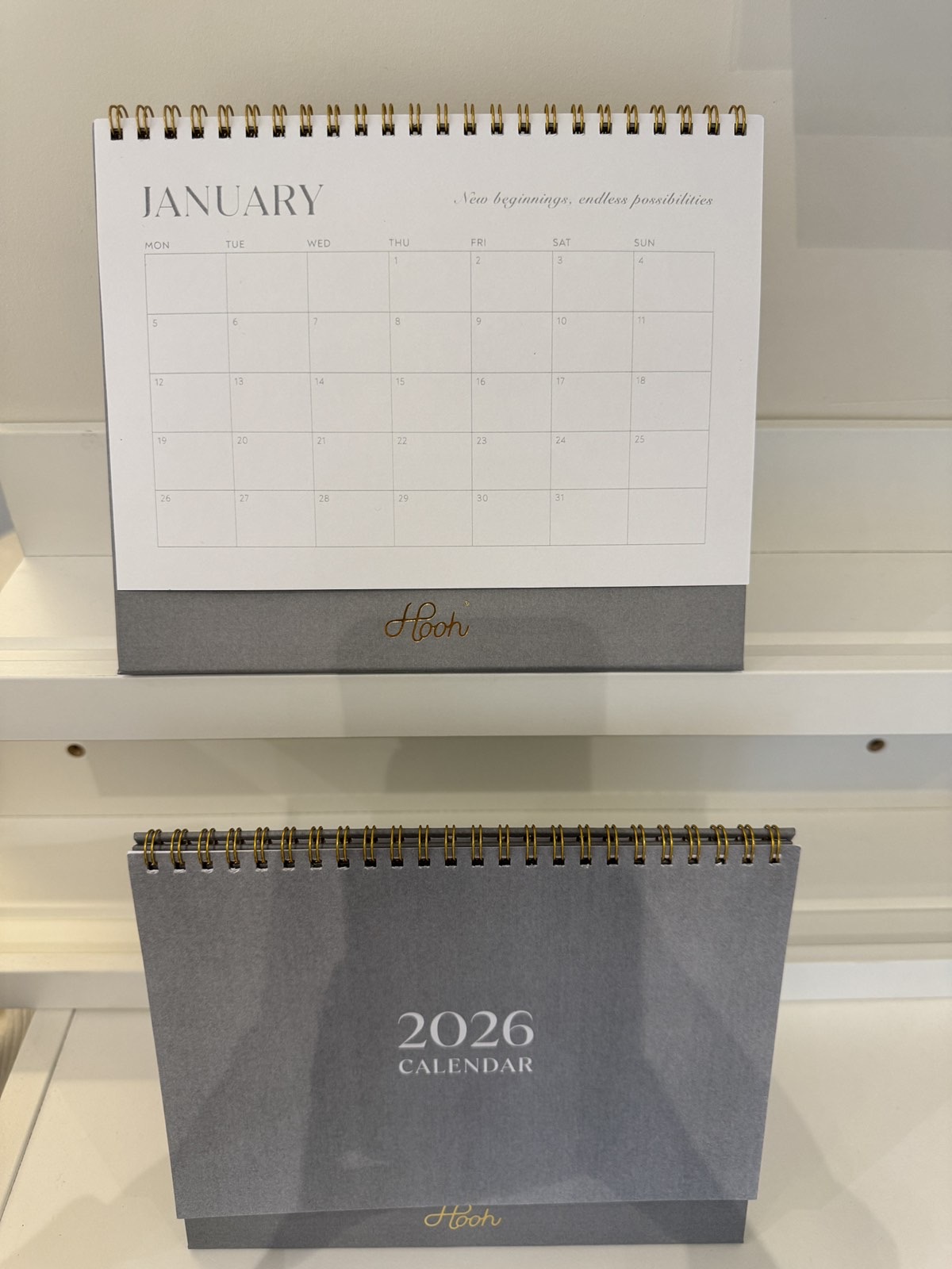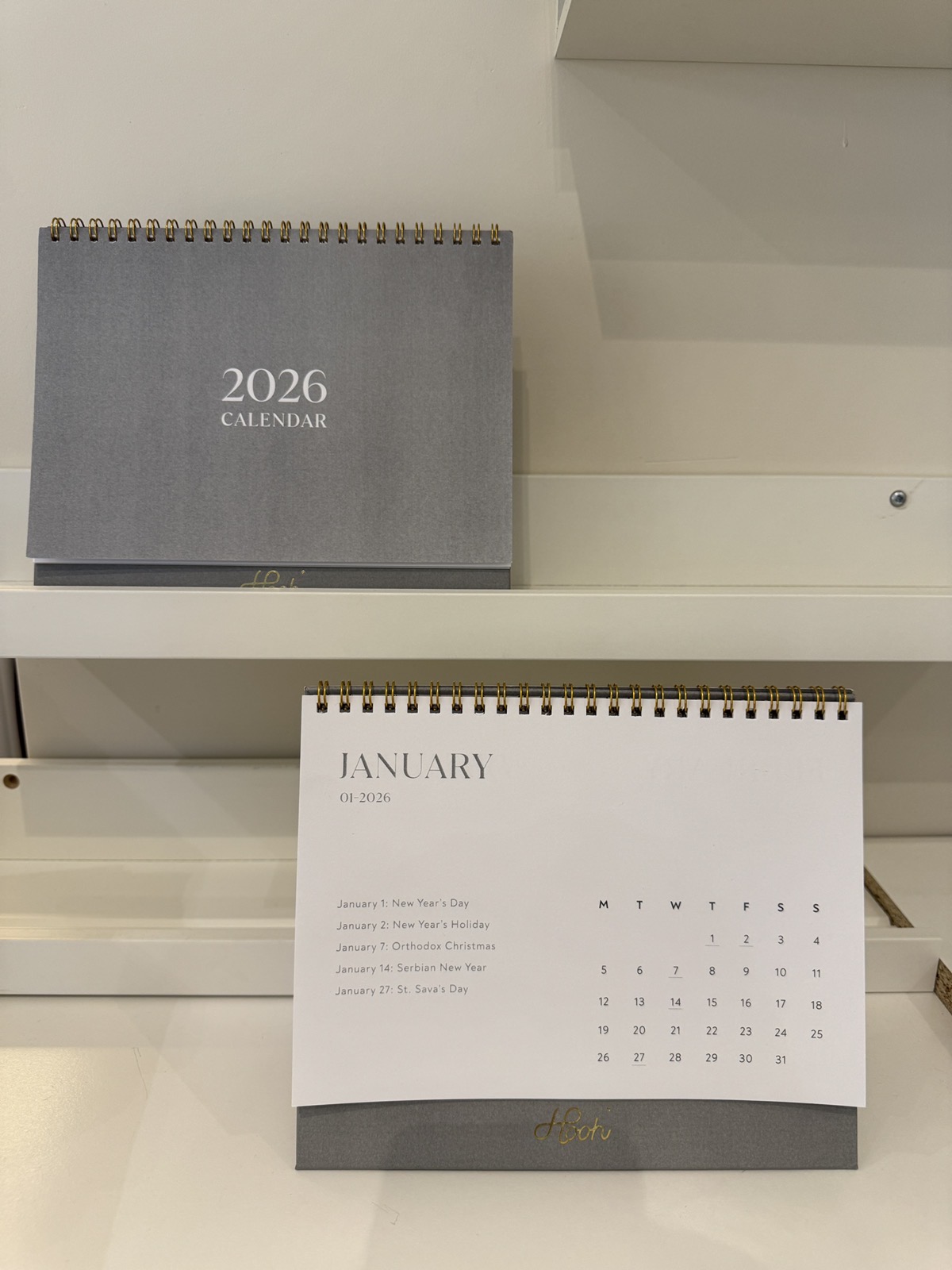 Hooh desk calendar for 2026, printed on both sides, so you can choose the month view that suits you better: one is with highlighted dates and numbers and days, and the other is a table where you can also write your events. A5 dimensions, on a spiral.